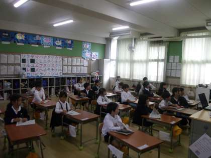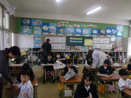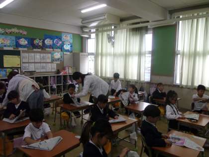 本日(10月28日)の2,3限に区役所や消防署の方々にご協力いただいて、全学年で防災訓練が行われています。1年生の防災グッズ作りです。