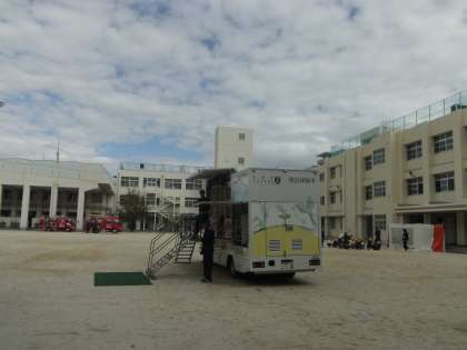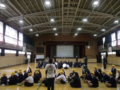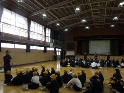 5,6年生は体育館で負傷者搬送体験、心肺蘇生法体験をしています。起震車体験もする予定です。