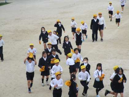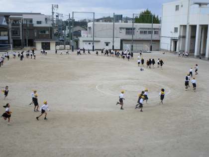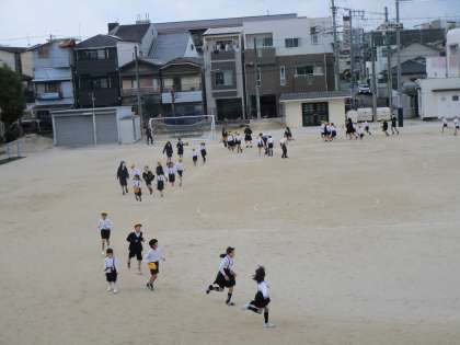 体育の授業や休み時間に、運動場のトラックを走った周回数を「かけ足カード」に記録していきます。低学年は50周、中学年は80週、高学年は100周を達成したら記念メダルがもらえるので、多くの児童が頑張っています。