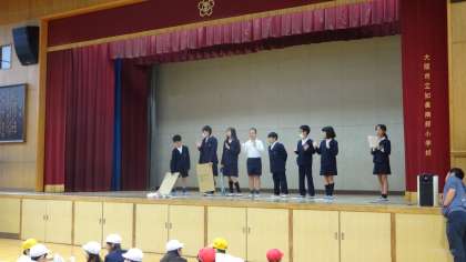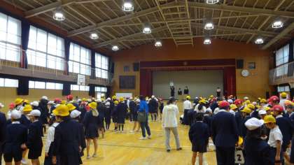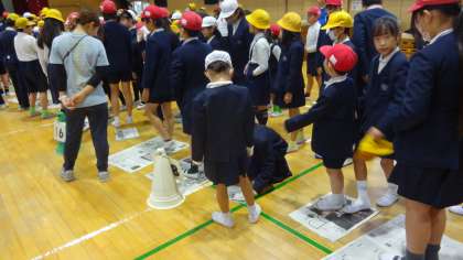 木曜日の朝は、集会委員会による児童集会を行っています。たてわり班でゲームをして交流を深めました。ジャンケンに負けると新聞紙を折りたたみ、その上に立ちます。新聞紙から落ちてしまうとアウトです。