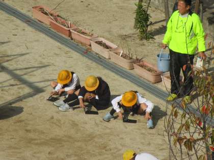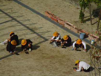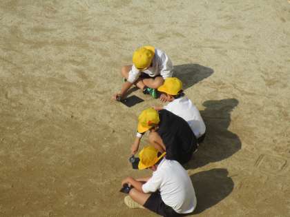 運動場に出て、黒い画用紙に虫眼鏡で太陽の光を集めてみました。