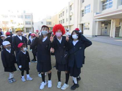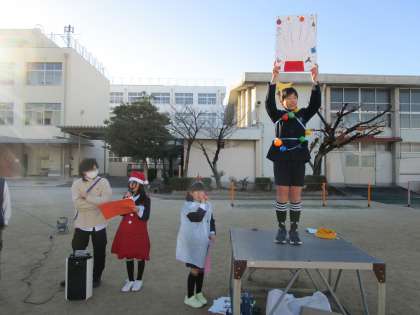 クリスマスの扮装をした集会委員の児童が、じゃんけんで何を出すか予想して大移動。今朝は寒かったですが、元気に過ごしました。