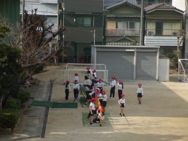 2年生の体育です。鉄棒となわとびに分かれて行っています。