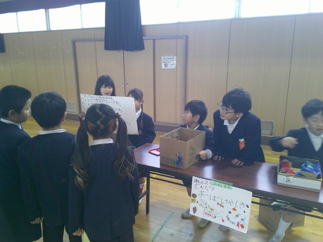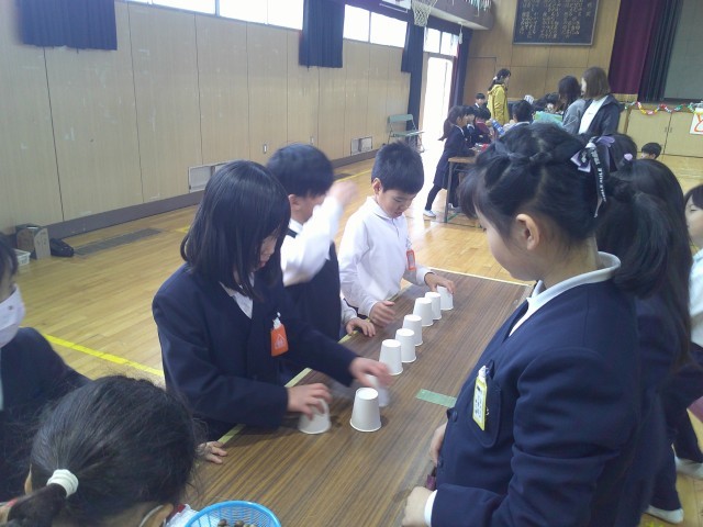 1年生がどんぐりを使って作ったゲームに2年生を招待して楽しいゲーム大会をしています。