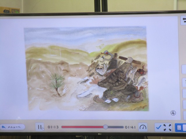 デジタル教科書を活用して、『花さかじいさん』の読み聞かせを行っていました。