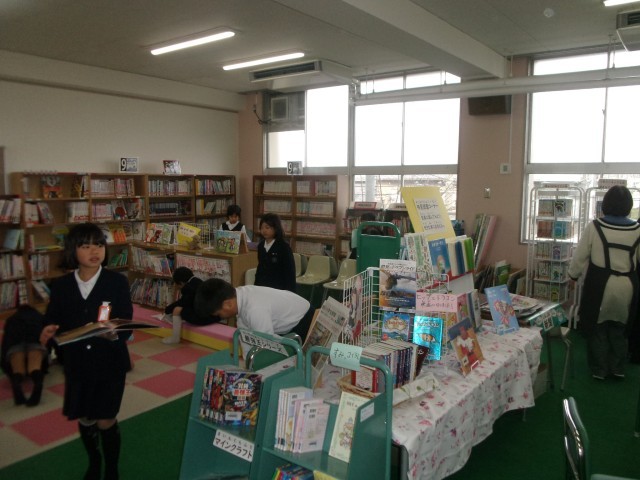 1組が教室で国語の授業を、2組は図書室で昔話の本を読んだりしています。
