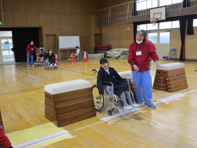 車いすに乗って自分で操作することで、段差を乗り越える時の苦労や、坂道を下るときの怖さなどが実感できたようです。