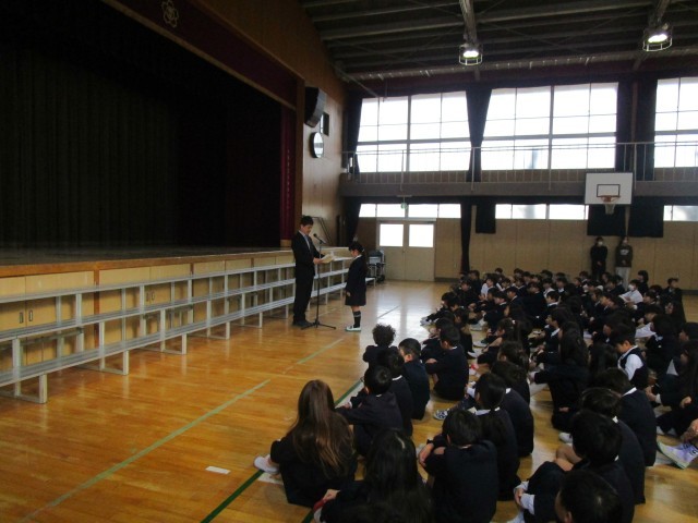 本日は、月初めの月曜日だったので、講堂にて児童朝会が行われました。