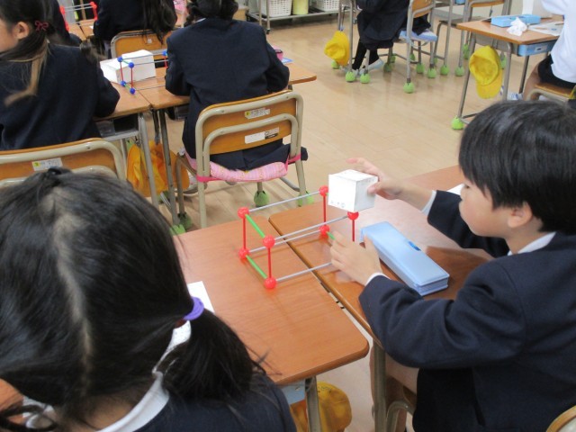 3種類の長さの「ひご」と「粘土玉」を使って直方体の模型を作り、頂点や辺の数を調べました。