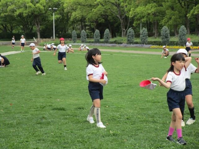 お弁当とおやつを食べ終えた子どもたちが鬼ごっこをし始め、最後はみんなで「色鬼ごっこ」を楽しみました。