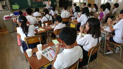 歯ブラシで歯垢がついている歯をきれいに磨いています。虫歯にならないように、食後は歯磨きをきちんとしましょう。