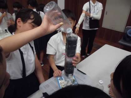 柴島浄水場の場内をまわって水がきれいになっていく過程を見学しました。そのあと、ろ過の実験をして、水がどのようにしてきれいになっていくかを実感することができました。