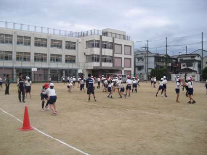 曇天でしたが運動場での実施です。準備運動の後、ゲームをしました。