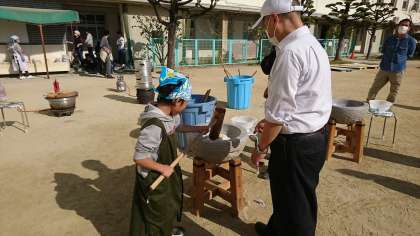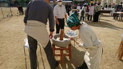 11月17日の日曜日、平野南小学校でPTA餅つき大会が行われました。子どもたちは、力一杯餅をついていました。できた餅は、きな粉や砂糖しょう油でおいしくいただきました。