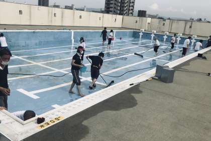 先生たちや管理作業員さんが、1年間の汚れを全力で落としています。5.6年生の子どもたちが気持ち良く、水泳授業ができるようにがんばっています。