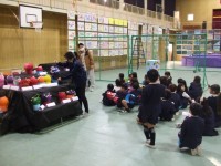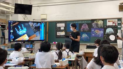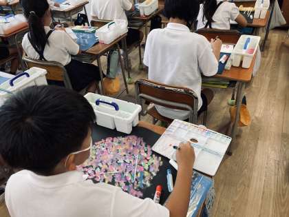 題材「ふしぎなクラゲ」を通して、スタンピングの技法も使い、作品を共有して表現する喜びなどを学びあっています。