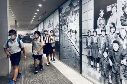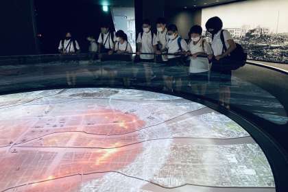 資料館内を見学。原爆や戦争の悲惨さを学んでいます。過去のものとしてとらえず、未来につなげてほしいと思います。