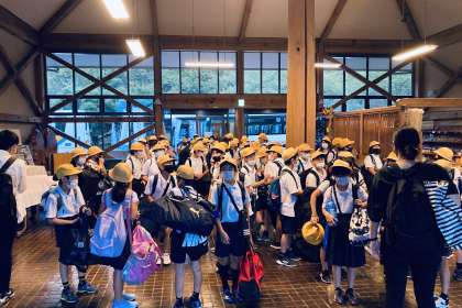 蒲刈島「県民の浜」に、無事到着しました。入館式をおこない、夕食や入浴を済ませていきます。