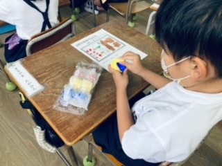 カラフルなおべんとうを題材に、粘土を使って、3色から様々な色ができることを学び、自分が描いた色に近づけています。