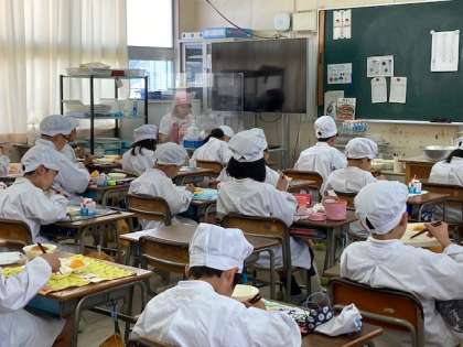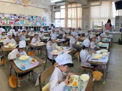 今日のメニューは、焼きそば(鰹節付)オクラ、パン、牛乳、オレンジです。みんな美味しくいただいています。