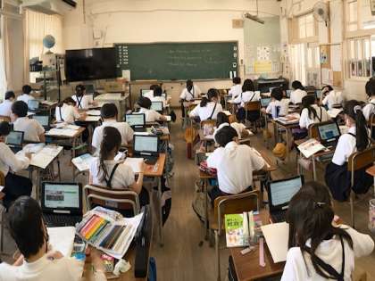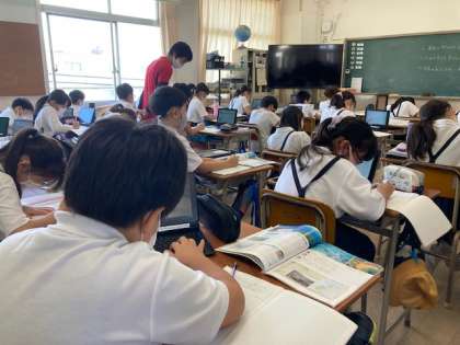 タブレットを使って、沖縄の暖かい気候や観光など、県がかかえる課題についても調べています。それをノートにまとめています。