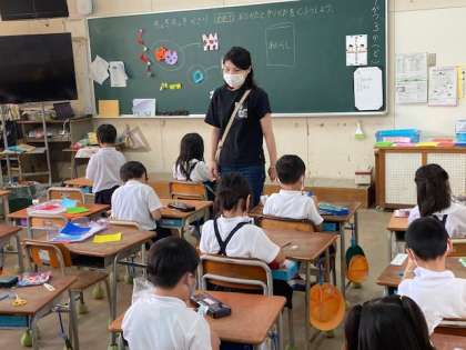 1年図工の授業です。めあては、おりかたときりかたをくふうしようです。