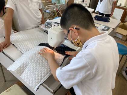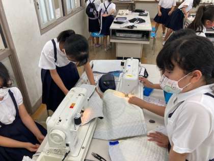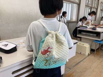 ミシンを使って、ナップザックを作製しています。日常的に使えるサイズです。