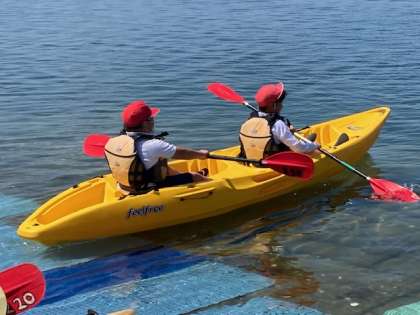 1組から、カヌー体験をおこなっています。2人が力を合わせて?!