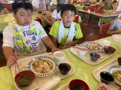 昼食(中華丼)をいただいています。この後、荷物整理や清掃を行い帰校準備に入ります。