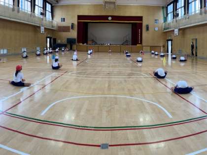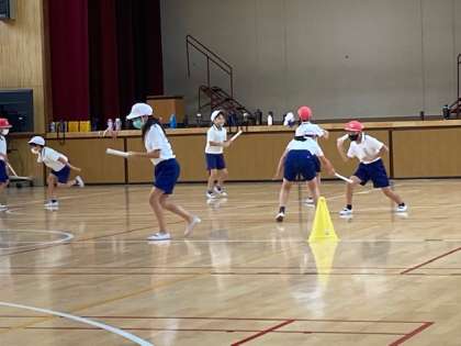 4年体育です。フィジカルディスタンスを保ちながら、取り組んでいます。