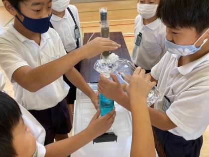 コロナ禍で、浄水場に社会見学にいけなかったので、水道局の方に出前授業をしていただきました。スライドを使って学習をするとともに、水が浄化していく実験をしています。