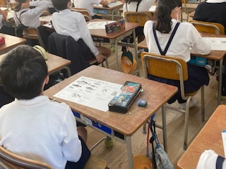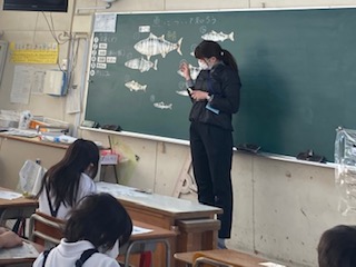 栄養教諭から、魚の漢字や栄養成分などを楽しく学んでいます。