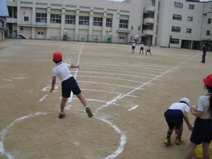 運動場では、「ソフトボール投げ」を実施しました。残念ながら、3時間目からは雨で運動場は使用できませんでしたが、講堂でも測定が行われます。