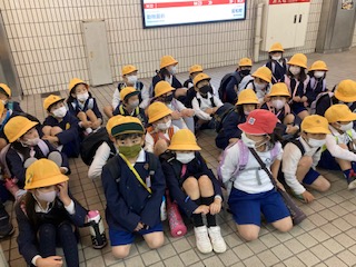 天王寺駅で、行儀よく電車を待っています。初めて電車に乗るお友だちもいて、興味深々です。