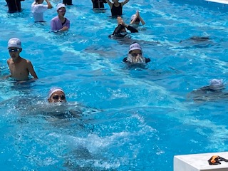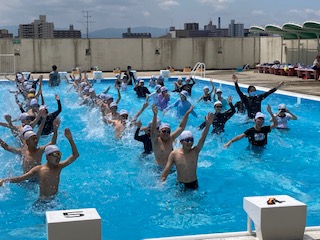 6年生が、入水して見本に合わせて、動きをつけて、体をならしています。