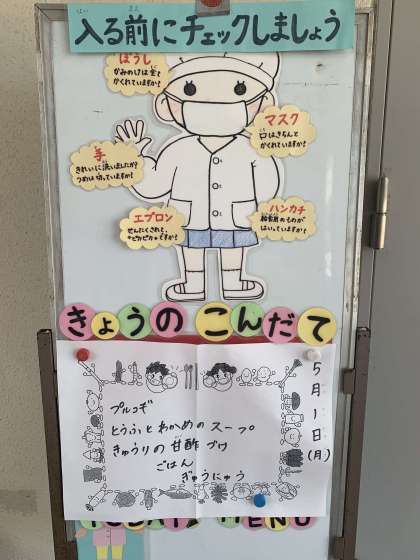 給食室も調理員さんが5月仕様に飾り付けをしてくれています。