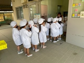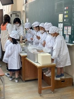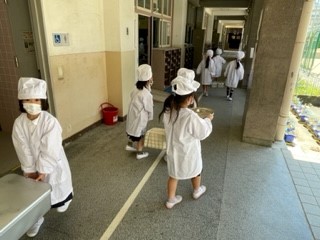 給食当番にも慣れてきました。まだまだ食器や大おかずは重くて大変。でも配膳は随分と上手になりました。