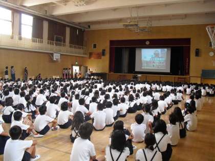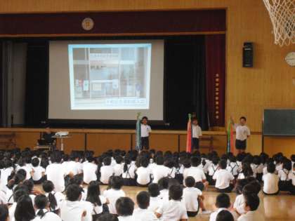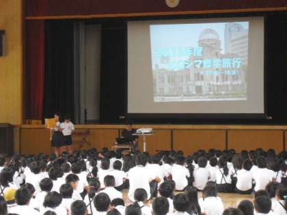 5年生までの下級生に修学旅行での平和学習での決意を話し、預かった「折り鶴」を平和公園に届けることを約束しました。