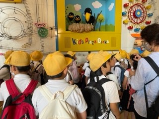 少し雨が降る中でのスタートとなり、雨の場合は、多目的ルームが予約でいっぱいだったので、学校へ戻ってからお弁当を食べる予定でした。ところが急遽キッズプラザホールを貸してもらえることになり、予定を変更してお弁当を先に食べてからの活動となりました。
