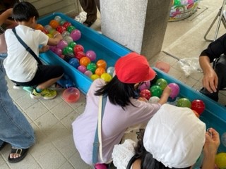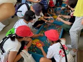 給食室の近くでは、縁日でおなじみの『スーパーボールすくい』と『ヨーヨー釣り』が出店されました。スーパーボールすくいでは、ポイがボロボロになるまで必死にすくっていました。