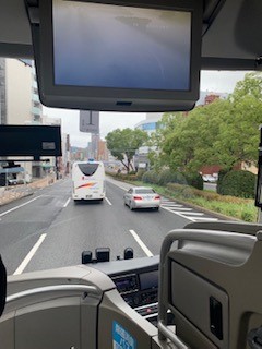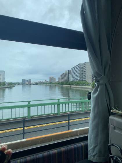 バスは広島市内に入りました。まもなく広島平和記念公園です。市内は雨は降ってません。