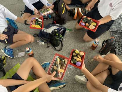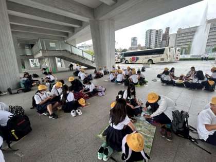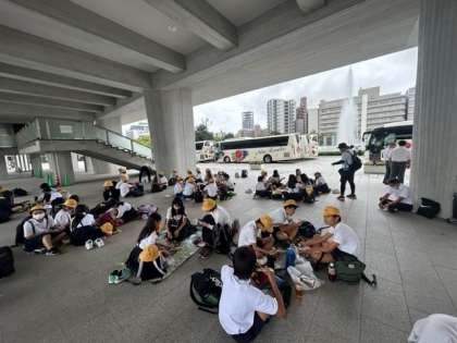 まずはお弁当で腹ごしらえです。遅れた場合は車中での食事も考えていたのですが、予定通りバスを下車してからの昼食となりました。ただ、天候も考え、記念館下で食べました。