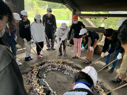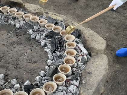 藻塩を作るには、海水を土器に移し、熱で水分を蒸発させて作ります。そのためものすごい暑さです。苦労して出来上がった藻塩は、あつあつのジャガイモに付けて試食しました。