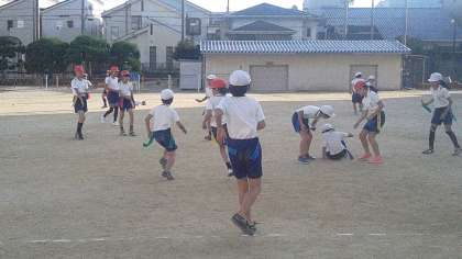 今日は、5年生が体育の授業でタグラグビーを学習しました。運動場から大きな歓声があがっていました。