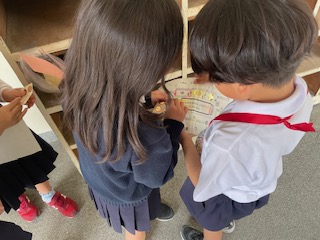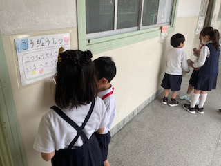 本日2・3時間目に1・2年生合同で「学校たんけん」をしました。2年生がペアの1年生をエスコートして学校を案内してくれました。各教室がどんな部屋なのかの説明も優しくしてくれました。主要な教室の前にはポイントがありオリエンテーリング形式で楽しく学校をたんけんすることができました♪