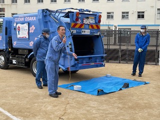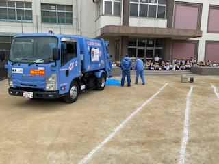 本日、環境局の職員の方にお越しいただき、社会科の「ごみの収集について」の出前授業を実施していただきました。パッカー車の仕組みを説明していただき、安全に作業するための工夫について学ぶことができました。また、ごみの分別についても講義いただき、持続可能な社会にしていくためにどうすればいいか考えるきっかけとなりました。