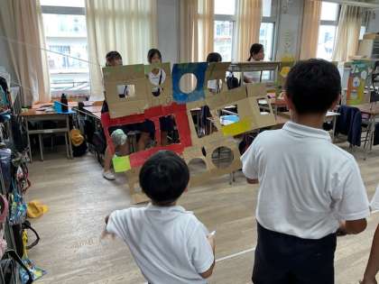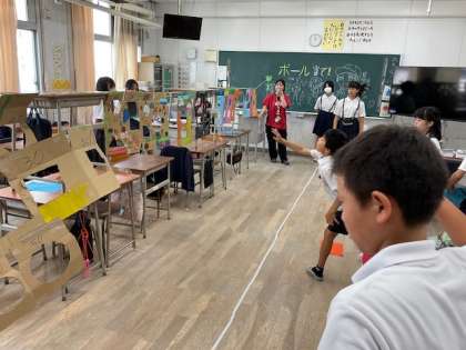 6年1組では「ボール当て」のお店が開かれていました。狙いを定めて的に向かって新聞紙で作ったボールを投げ込みました。