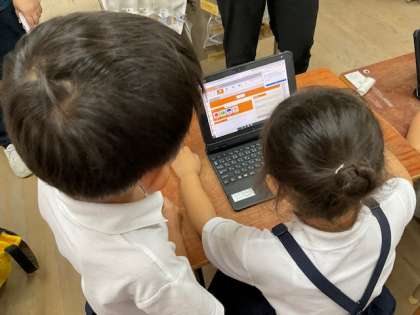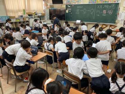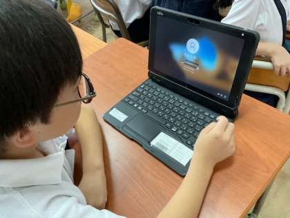 1年生でタブレット端末の使い方の学習をしました。まずは自分のIDとパスワードでログインすることから始めます。1年生にとっては、キーボードには見たことない記号や数字、アルファベットが並んでいます。初めて聞く言葉もいっぱいです。一生懸命取り組みました。すると、得意な子は迷っている子に自然に教え合う雰囲気がありました。うまくログインできた時にはお互いに笑顔が溢れていました。