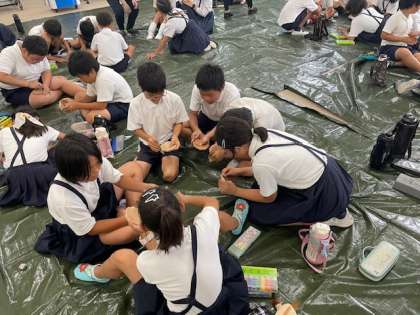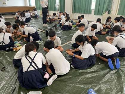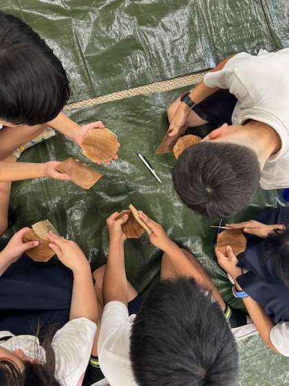 雨と雷注意報により、ハイキングは中止し、木のコースター作りを行っています。