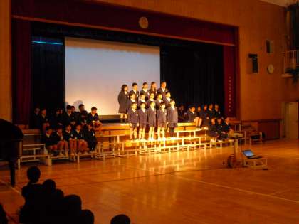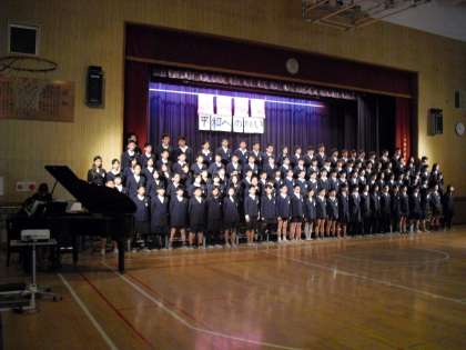 戦争の恐ろしさ、平和の素晴らしさを、修学旅行での学習などを織り込み、発表としてまとめました。そのなかでも、等身大の「自分たちにできること」を考え、発表の中に取り入れたことが素晴らしかったです。合唱の上手さはさすがでした。